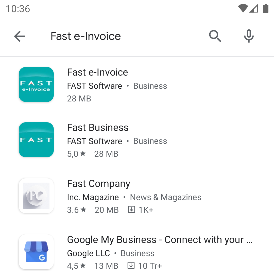 - Open the Google Play Store on your device. Type "Fast e-Invoice" in the search field. A list of apps will appear. Find the app developed by "Fast Software Company" and tap to select it.
